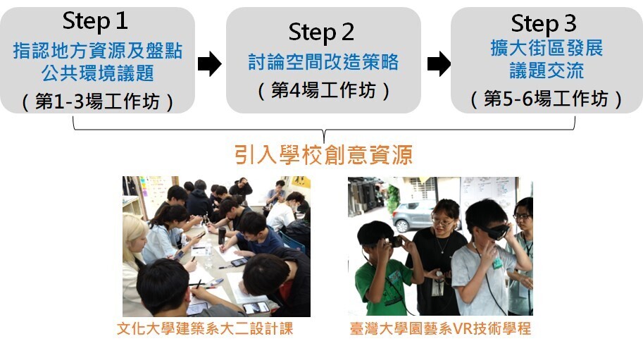 為收集街區內不同使用者需求及擴大民眾參與交流,結合社區課程、市集擺攤等活動,利用展覽海報、街道改造後模型、牌卡互動遊戲設計、VR實景體驗等道具。