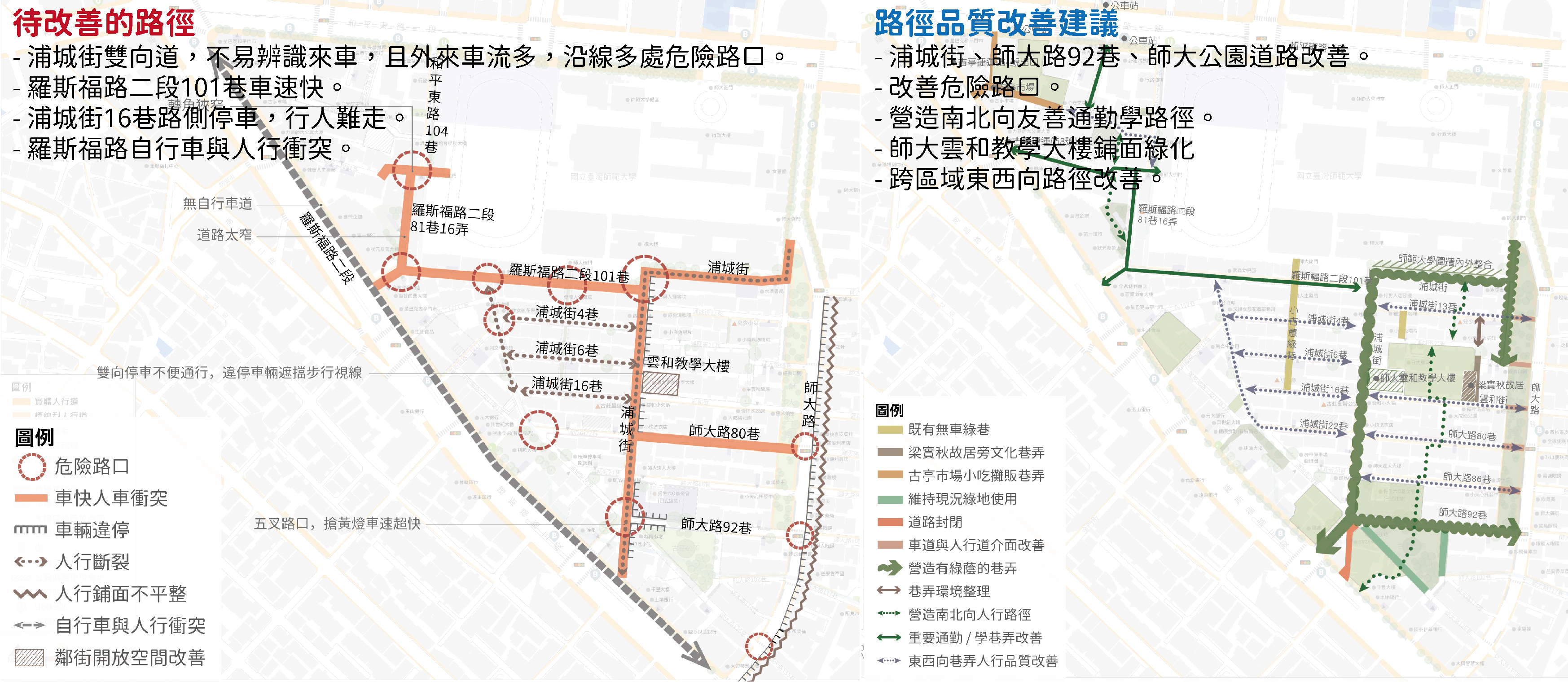 民眾指認待改善的路徑有外來車流多、危險路口、車速快、不便行人通行、人車衝突(包含自行車)等情形,並針對路徑品質提出改善建議。